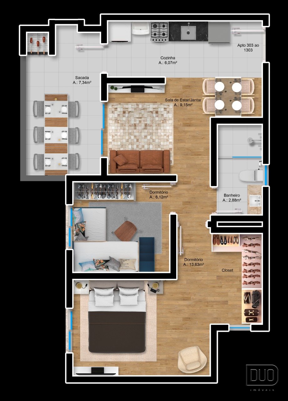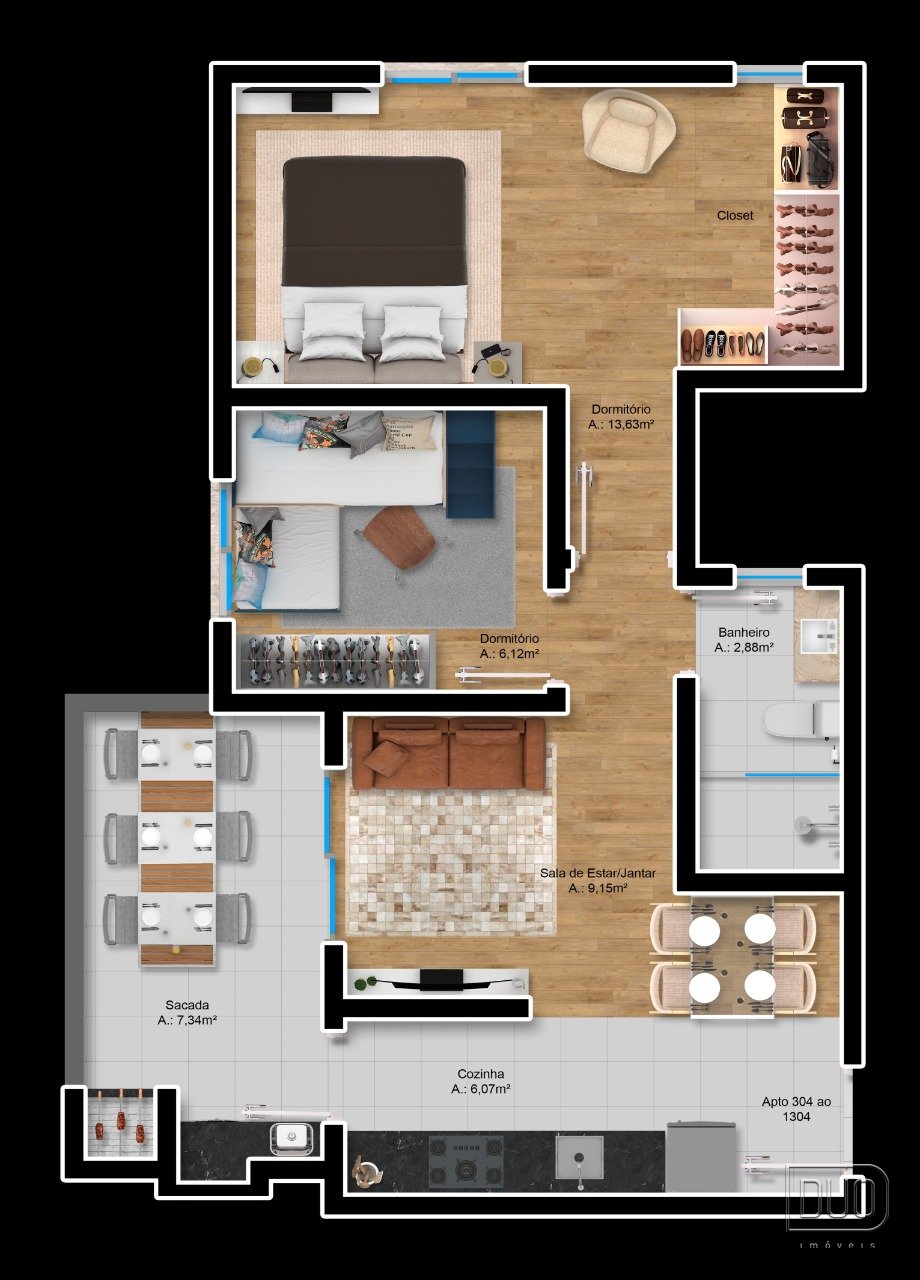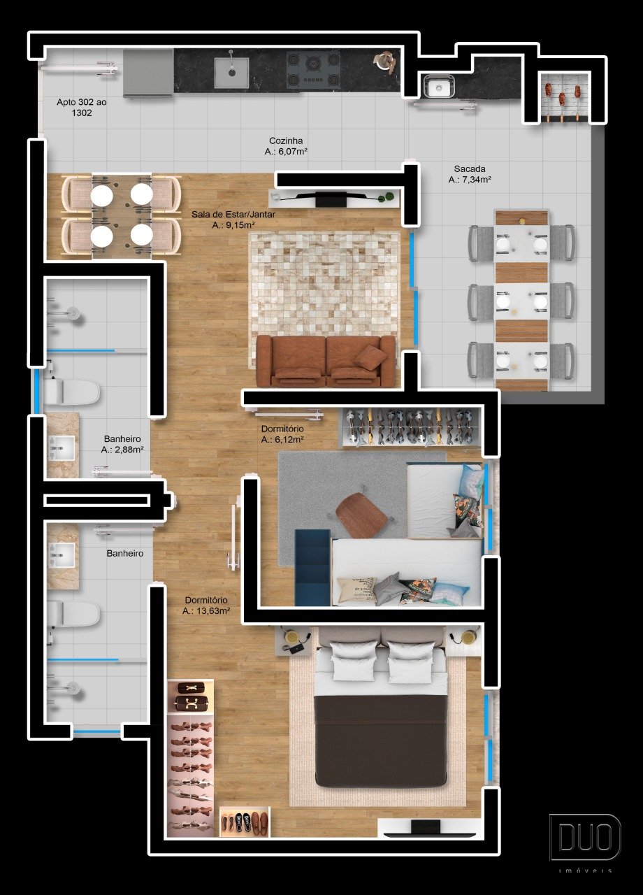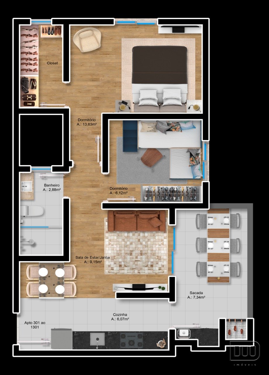 2 Dormitórios podendo personalizar para 1 suíte
