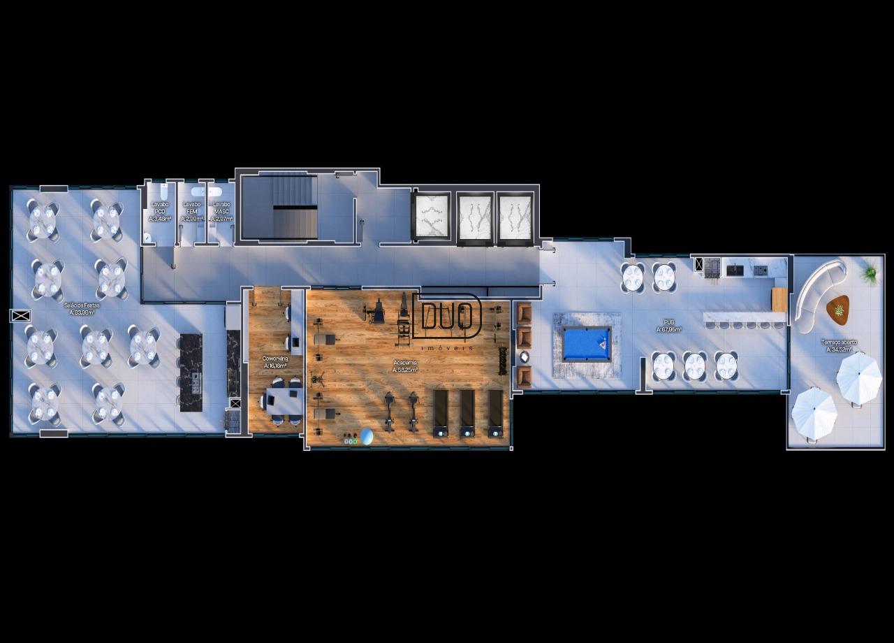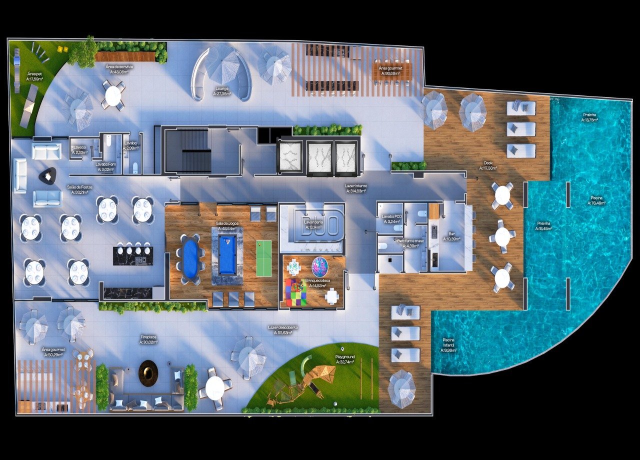 áreas de lazer decorada e equipada divididas em dois pavimentos,