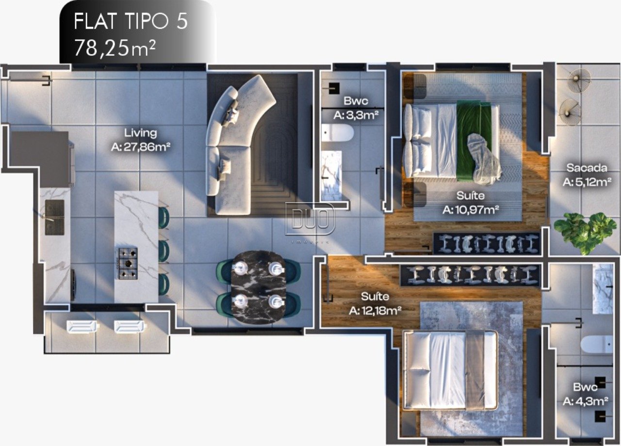 Tipo 5 - 78,25m² - 1 dormitório + 1 suíte