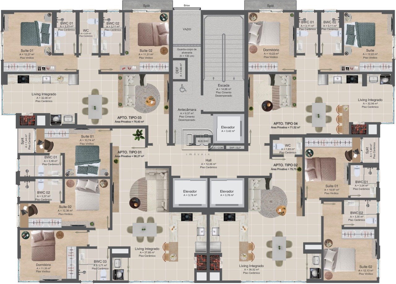 Tipo 1: 2 suítes + 1 dorm. - 96,27m² - 2 vagas