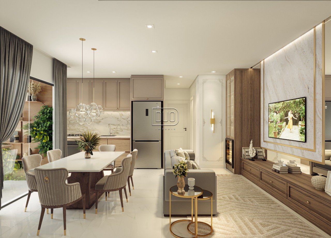 Piso em porcelanato no living, sacada, cozinha, área de serviço, banheiros e lavabo