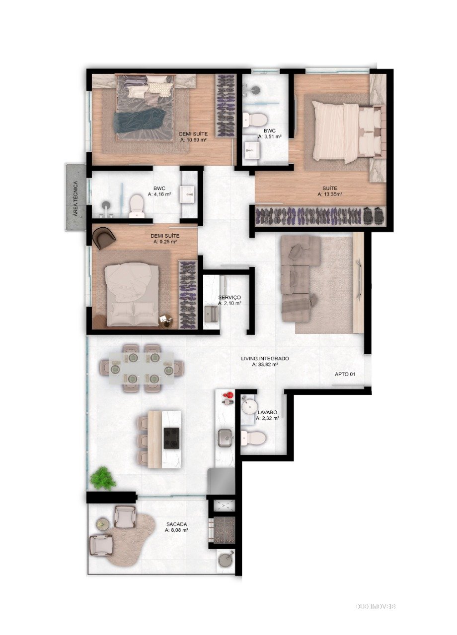 01 suíte + 2 demi com 105,30m²