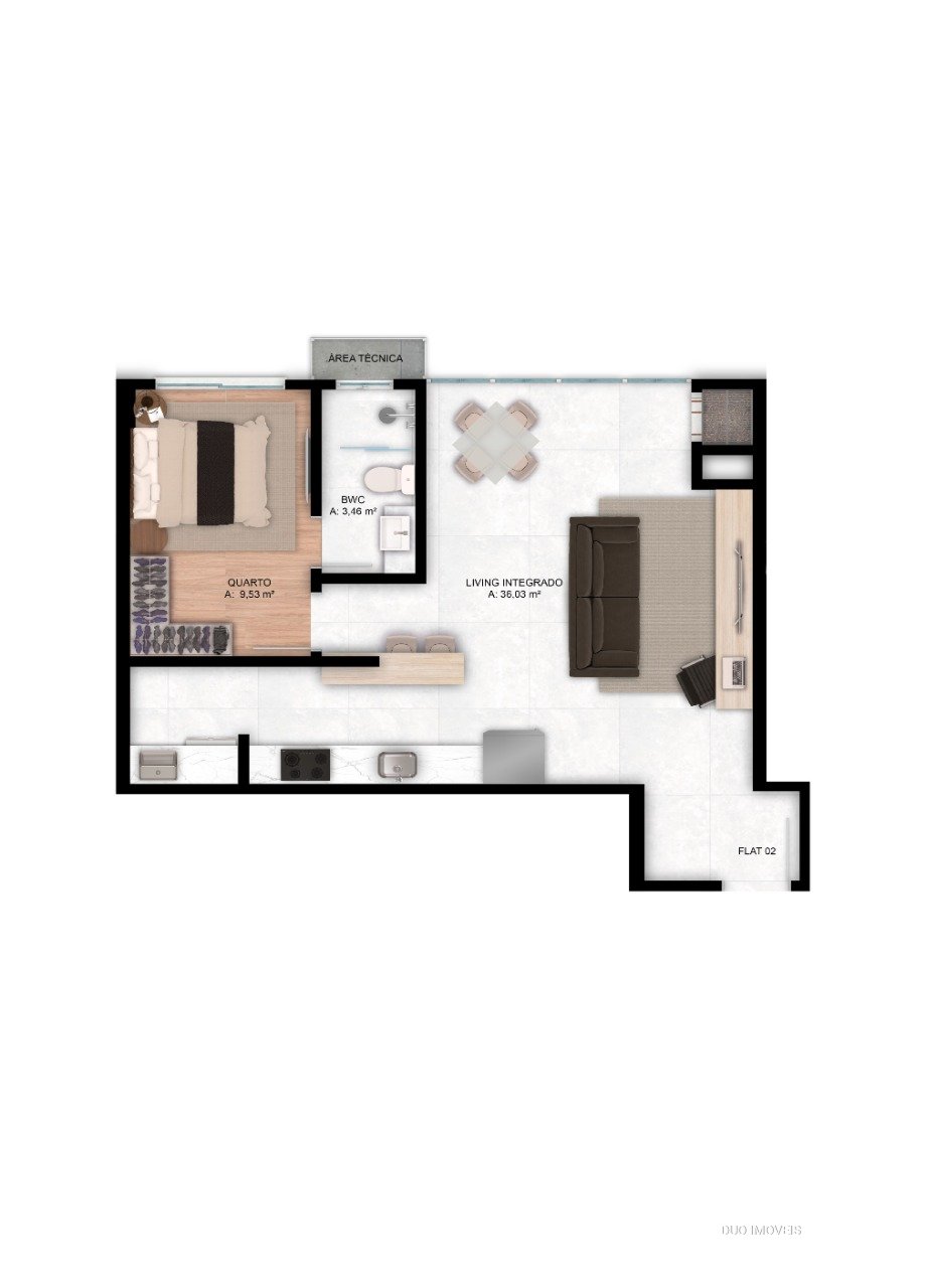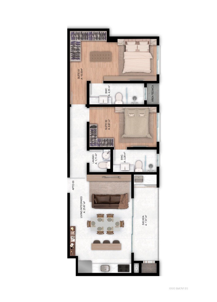 01 dormitório + living integrado com 56,10 até 56,60m²