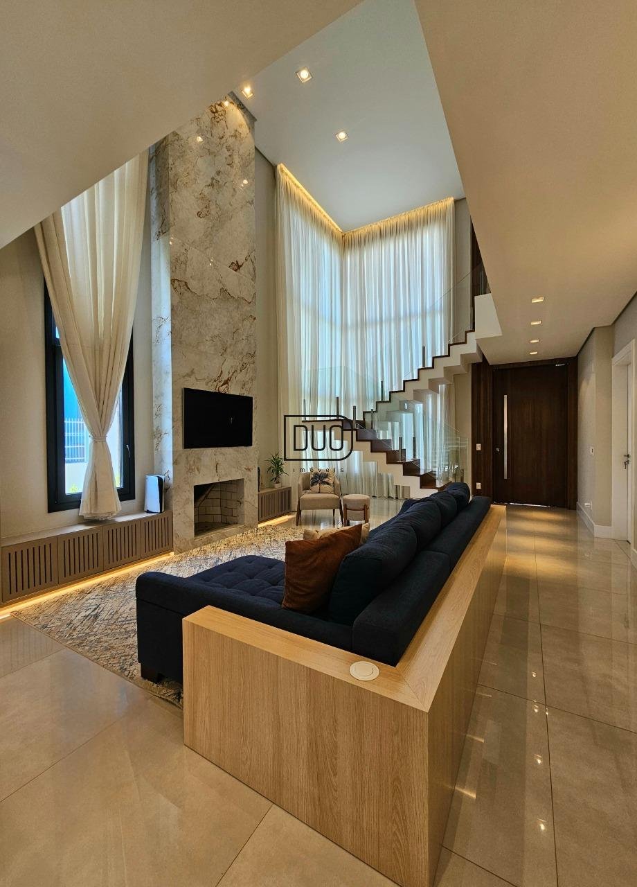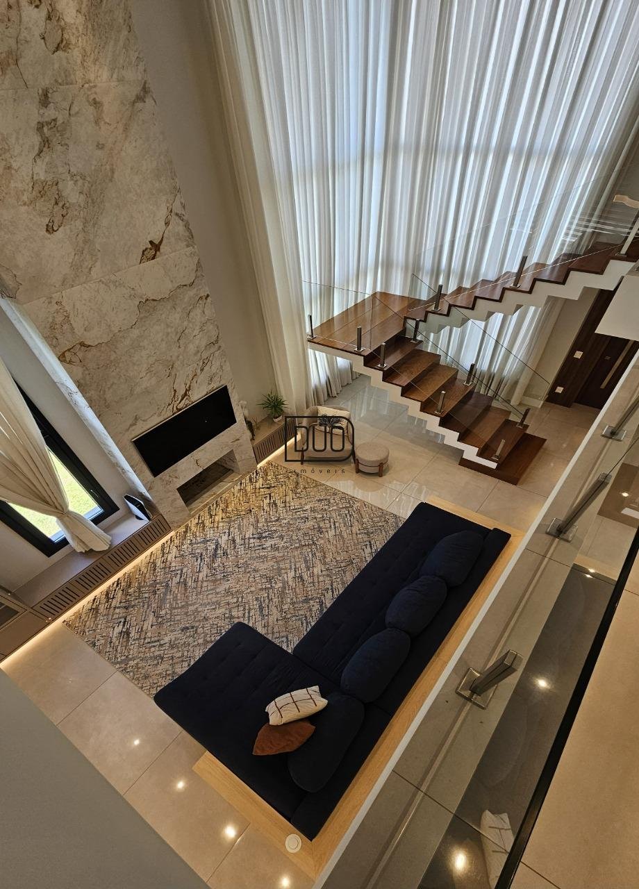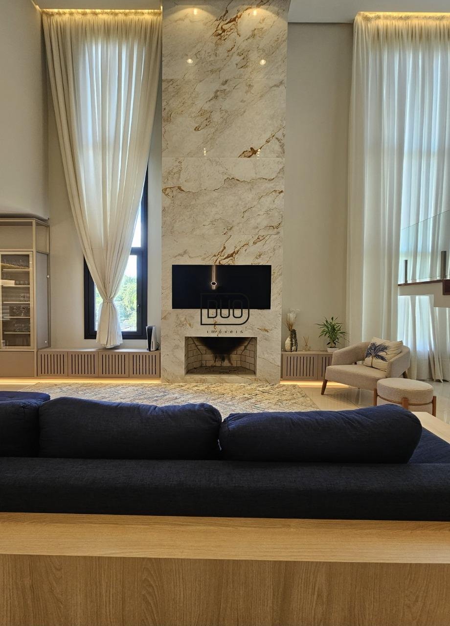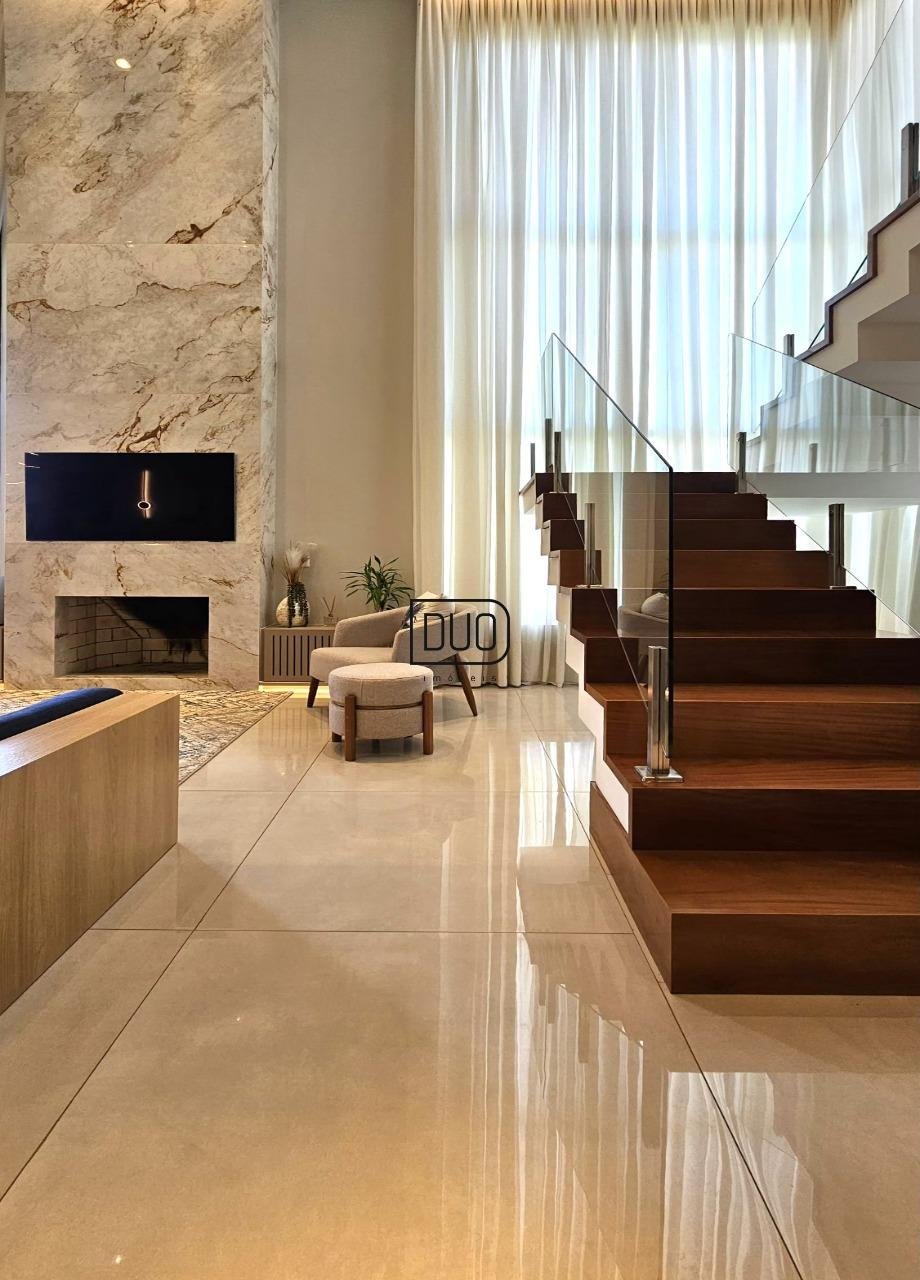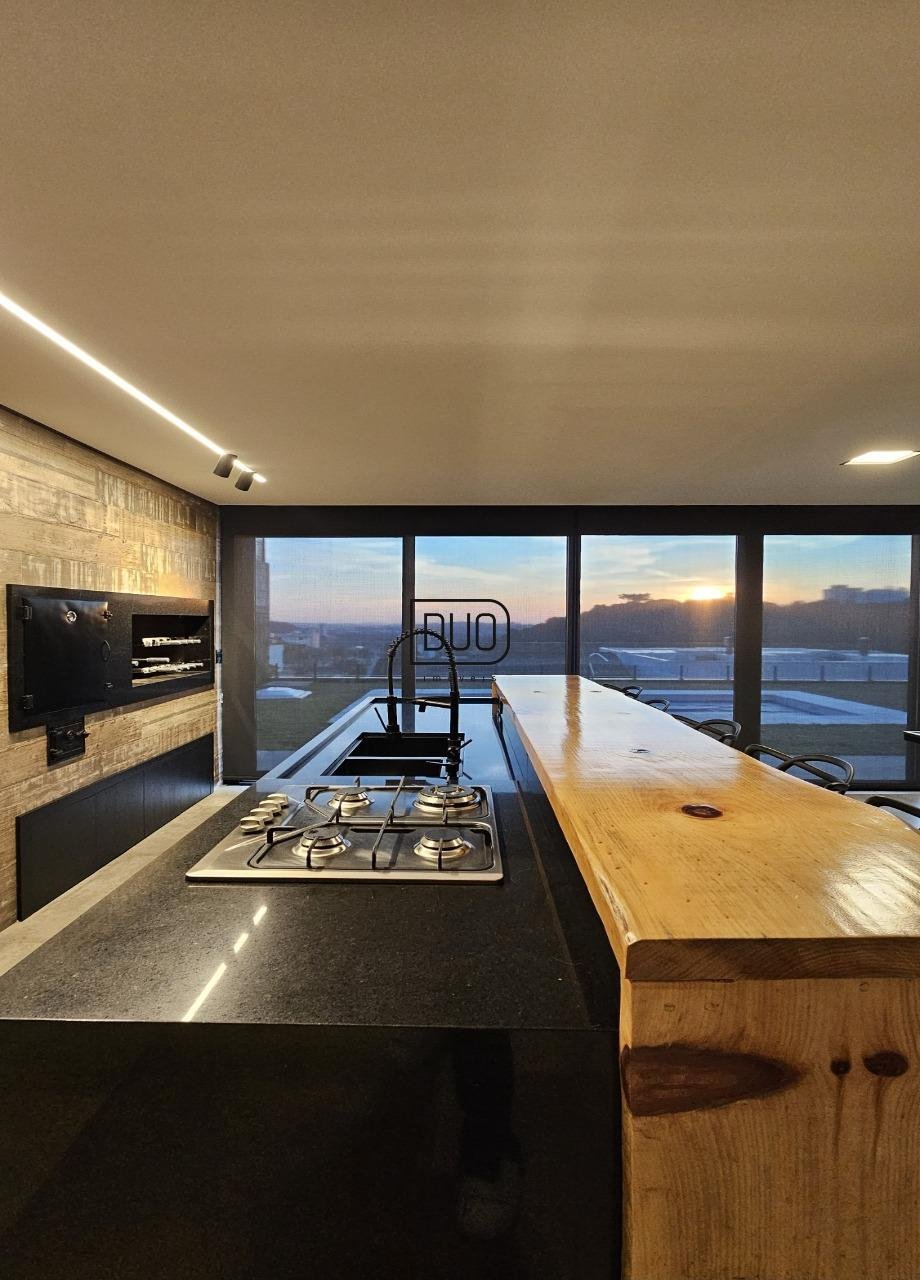 No segundo pavimento living integrado com sala de estar e jantar, e ampla cozinha com churrasqueira a carvão rotativa e um fogão extra dentro da churrasqueira. Sacada e porta-janelas amplas que te permitem ter uma vista definitiva. Lareira à lenha, piso porcelanato, ar condicionado de teto K7, pé direito duplo, escada em madeira e guarda corpo em vidro, lavabo, área de serviço separada e a garagem.