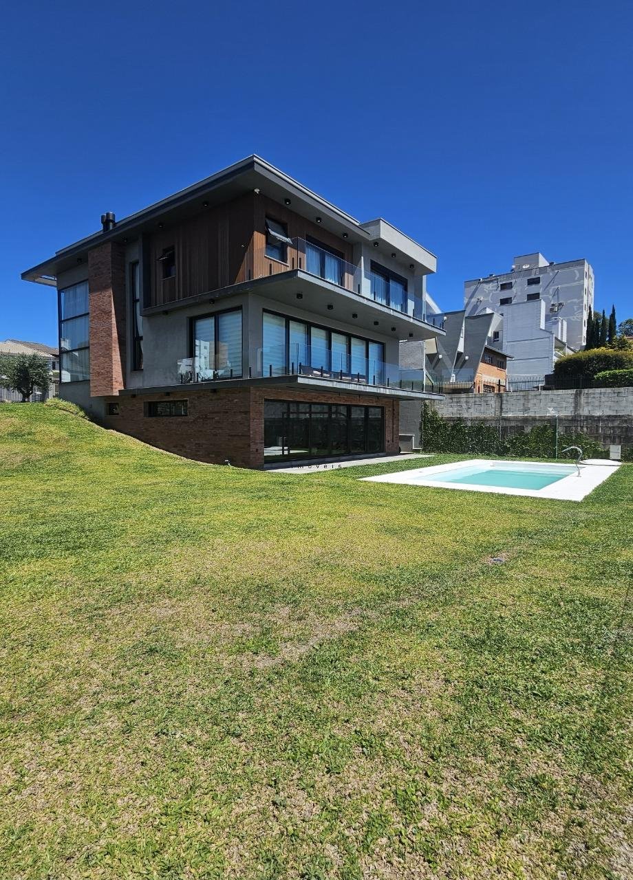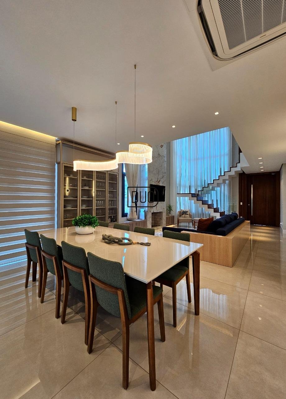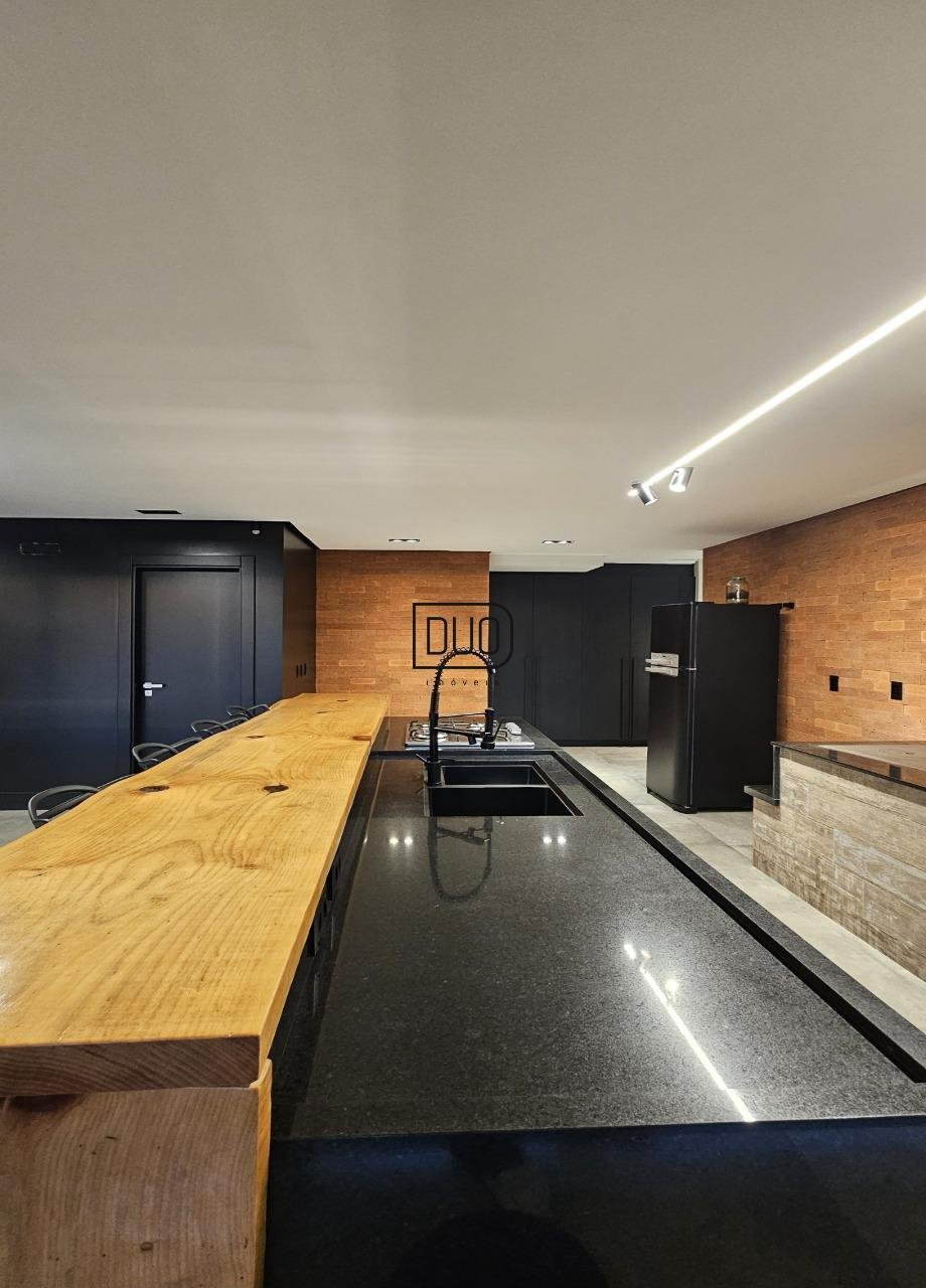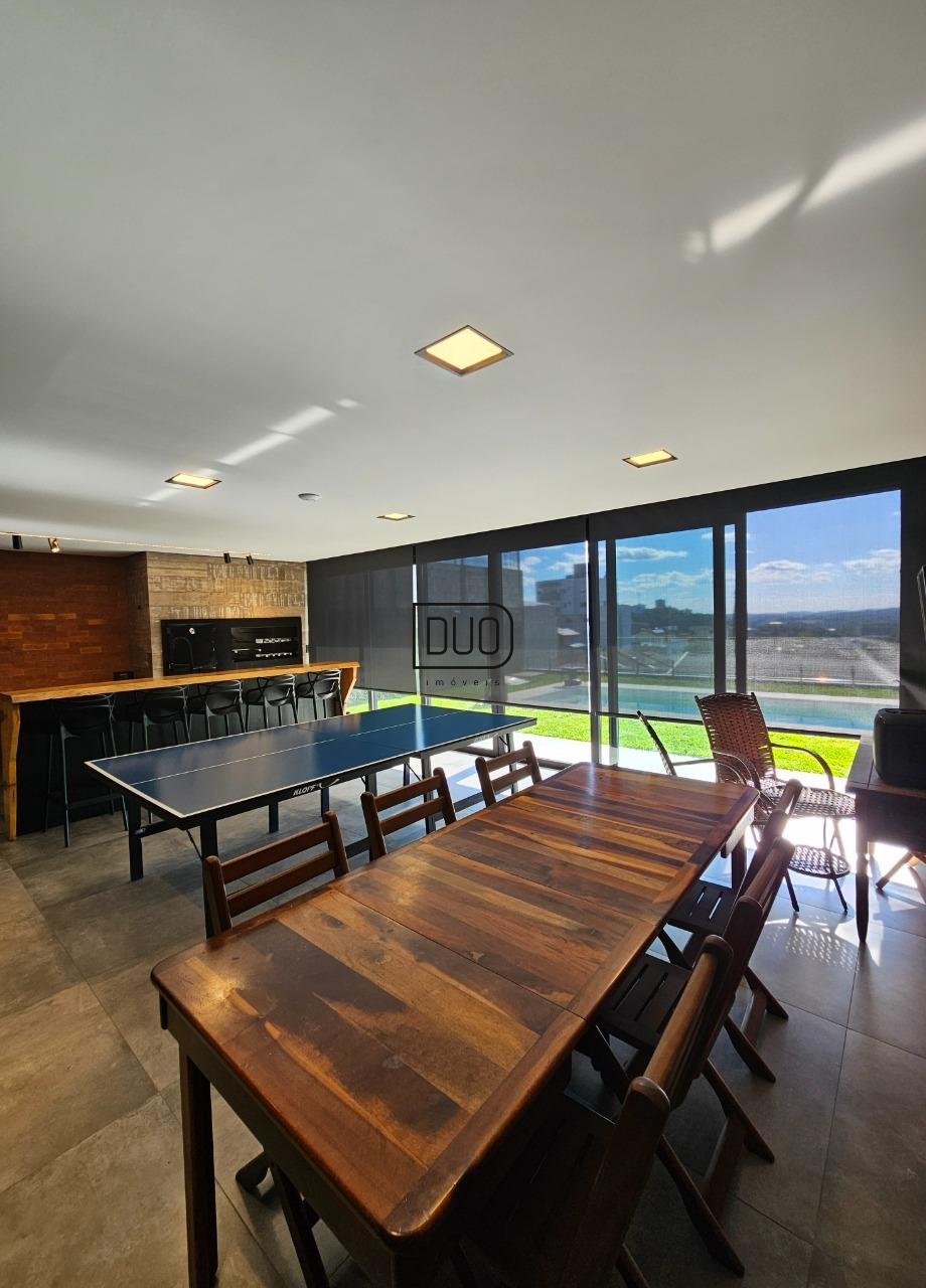 No primeiro pavimento um salão de festas com churrasqueira rotativa à carvão com espetos e grelha, forno à lenha e fogão campeiro, cozinha toda montada e equipada, lavabo, atelier e depósito amplo. Nesse pavimento você já tem acesso ao pátio e piscina. Acabamentos em porcelanato, espera para split.