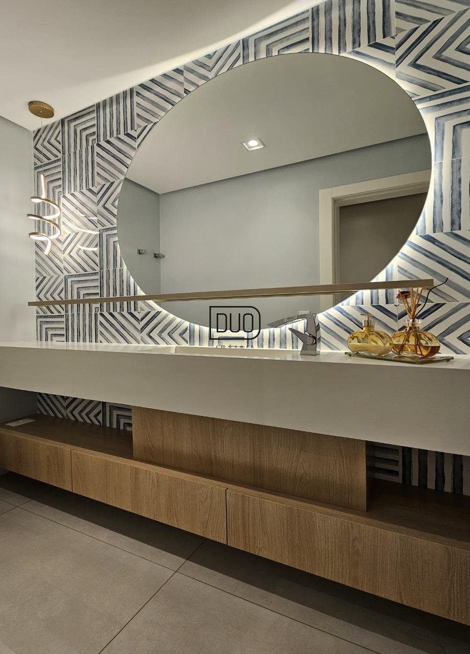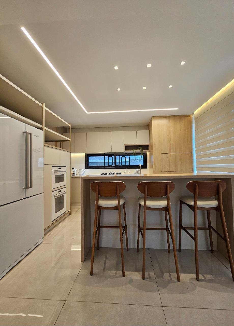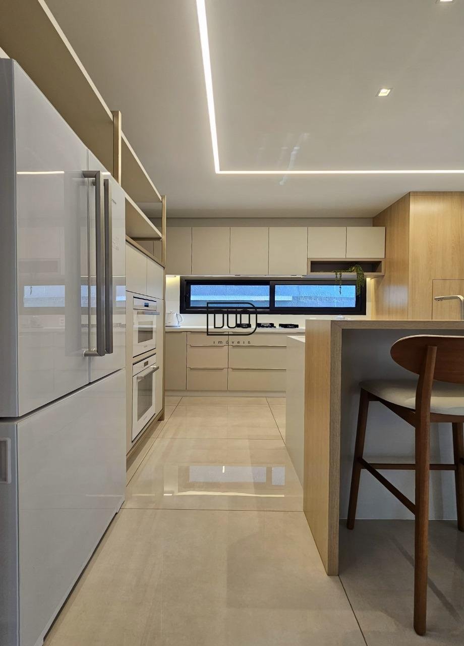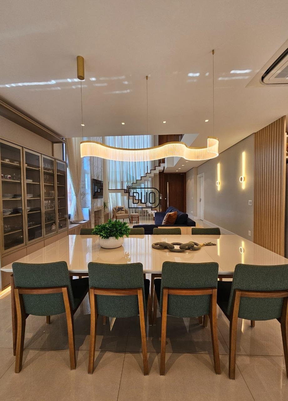 No primeiro pavimento um salão de festas com churrasqueira rotativa à carvão com espetos e grelha, forno à lenha e fogão campeiro, cozinha toda montada e equipada, lavabo, atelier e depósito amplo. Nesse pavimento você já tem acesso ao pátio e piscina. Acabamentos em porcelanato, espera para split.