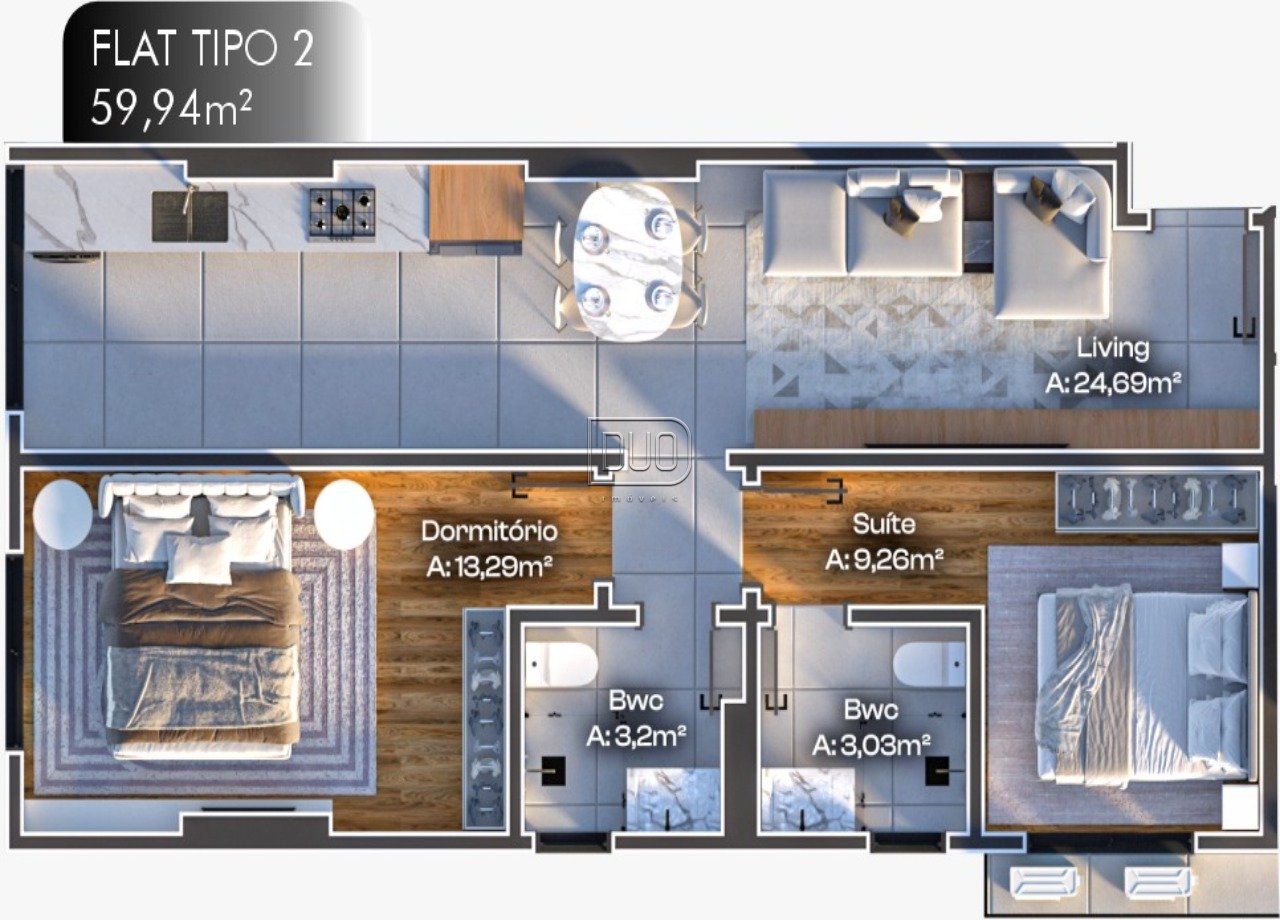 Tipo 2 - 59,94m² - 1 dormitório + 1 suíte